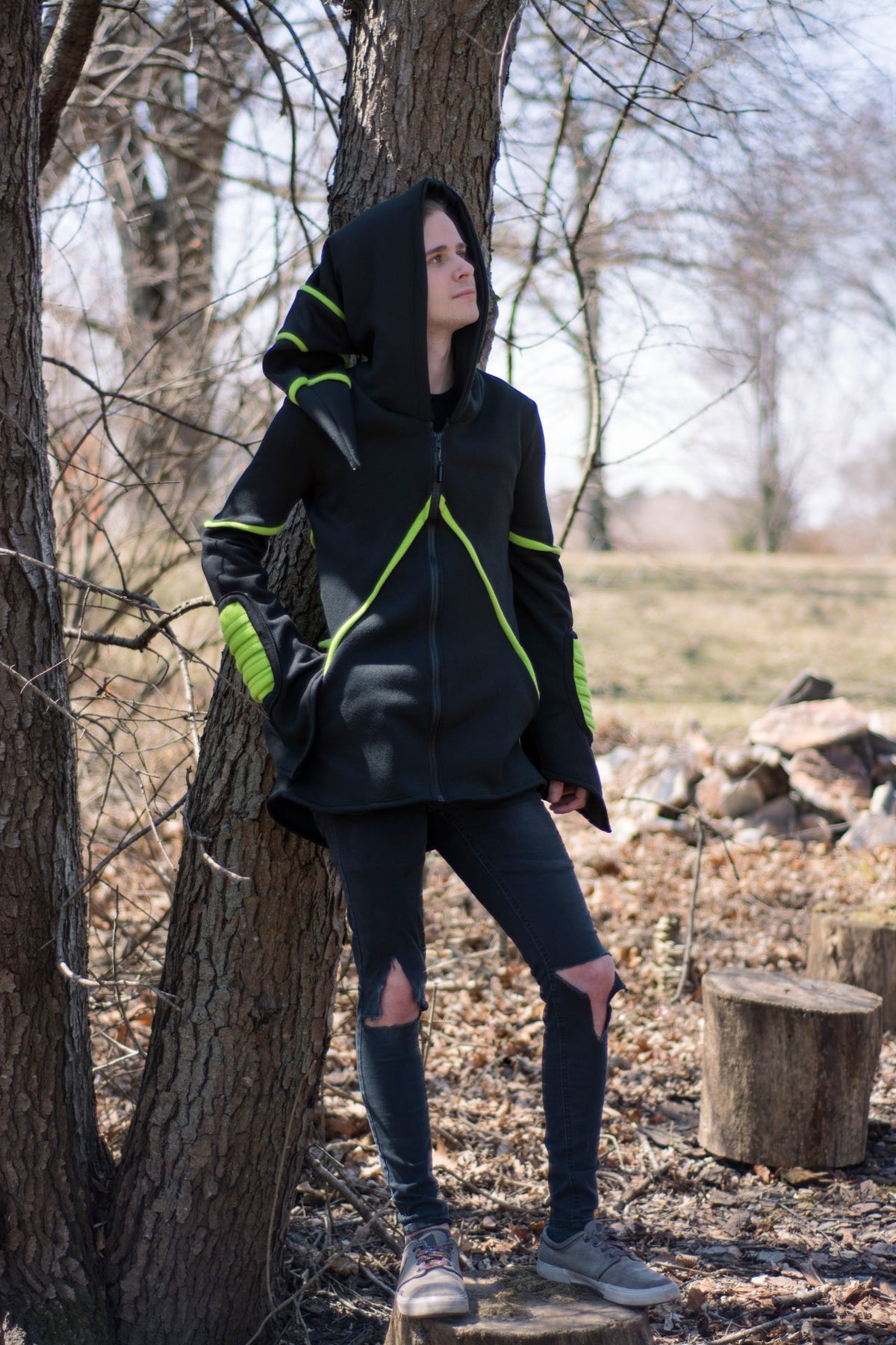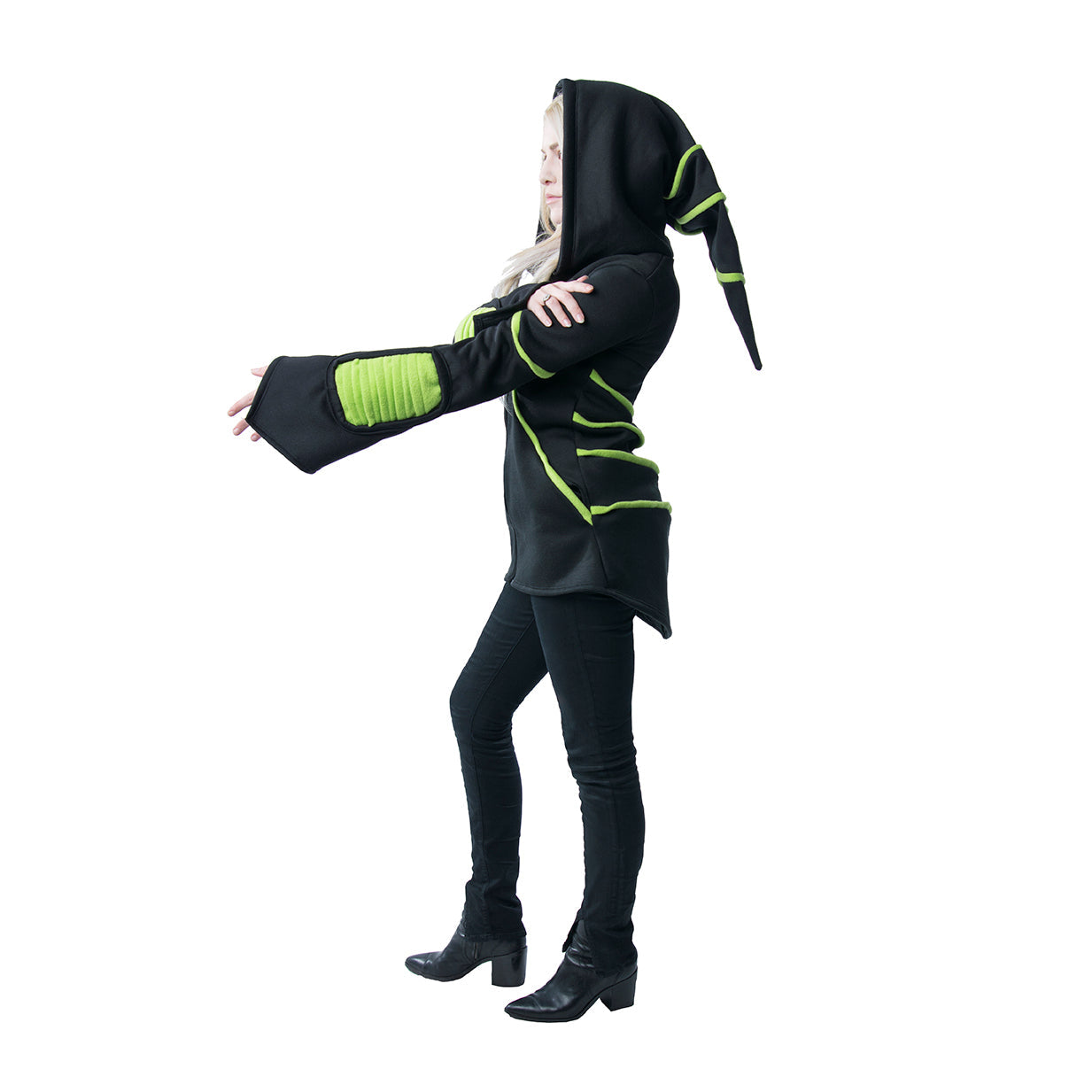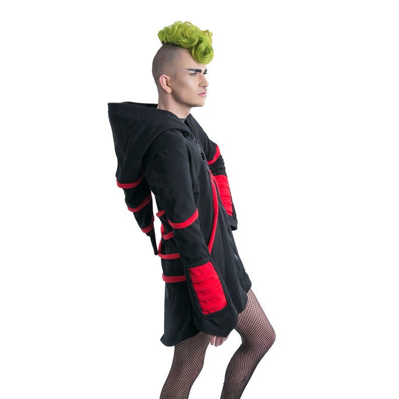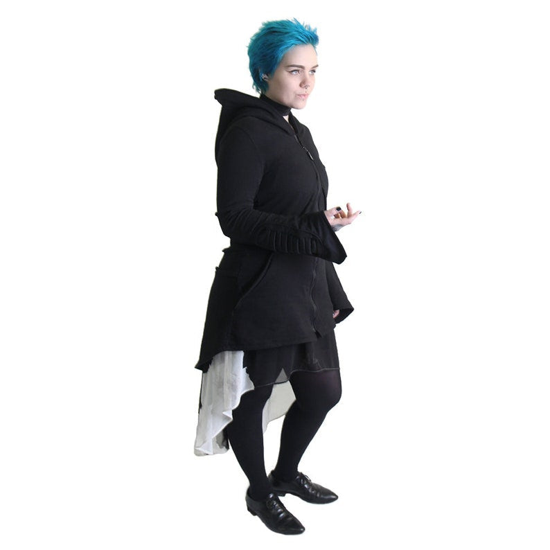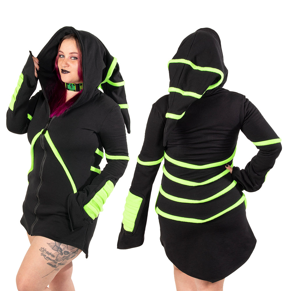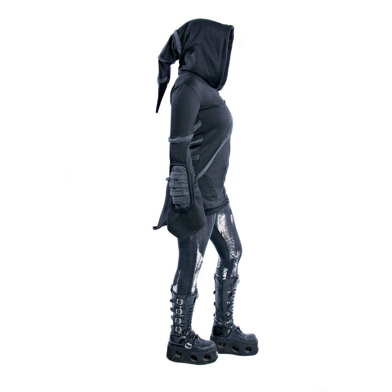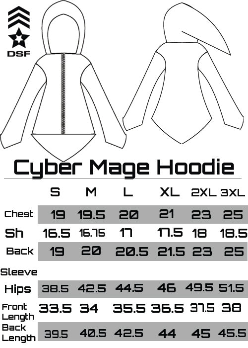 Our classic Cyber Mage Hoodie includes a oversized hood, and color matching ribbing on the forearms. Pockets are hidden on the slanted piping on the front.