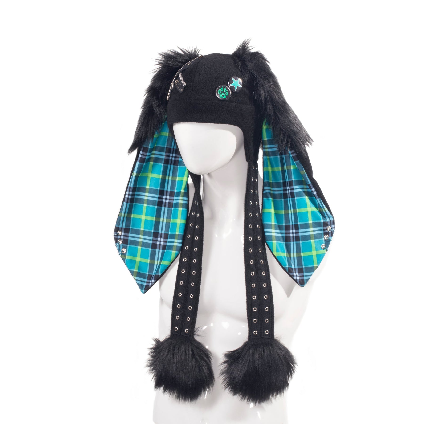 Grab your rabbit ears and keep warm in style with the Pin Punx MEGA Puffet Bunny Hat! Designed with 21" flomp ears and giant straps with mega squeaker puffs for ultimate coziness, you can take your look up a notch with 3 ear piercings per side and a smattering of safety pins plus two randomly-selected Pawstar Buttons that perfectly match the inner ear color. Go hop to it!